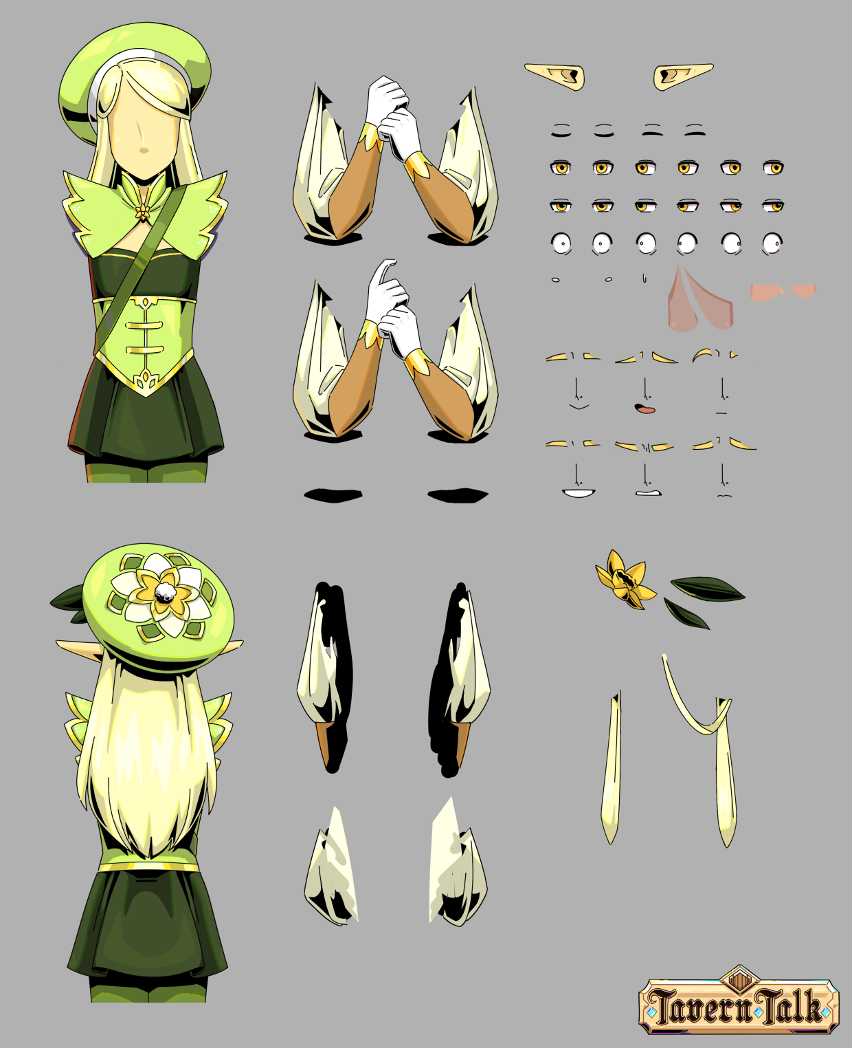 All characters have a main body with a blank face, different eye sprites and several separate facial expressions as well as some different arm positions. Additionally, to make it possible for our Artists to animate the characters as best as possible, we have to render most of the separately moving parts as their own sprites, f.ex. the several hair strands of Eleithyia or Fable’s Flower.